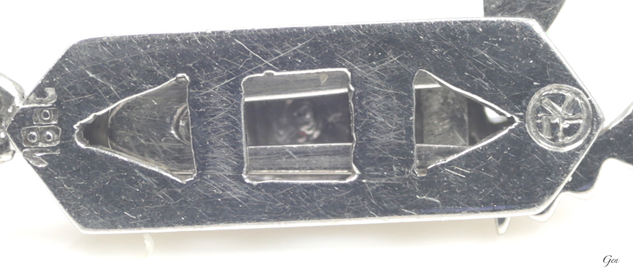 | クラスプもハンドメイドの特別製ですが、その両脇の金具にもダイヤモンド以外にキラリと輝く物が付いていますが、これはプラチナからまらうでローズカットダイヤモンドのような形に彫りだした物なのです!! イヤ〜驚きました!! これも初めて見る物です!! |