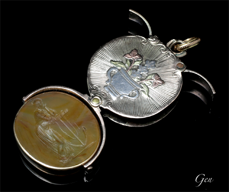 | フォーカラー ゴールド 回転式ダブルインタリオ付きフォブシール ヨーロッパ 1820年頃 14〜18ct フォーカラーゴールド(グリーン・ホワイト、ピンク。イエロー) コーネリアン、 直径2,7cm 重量 13,3g ¥388,000- スリーカラーの上をゆくフォーカラー・ゴールドの見事な彫金!! しかも表裏とも全く同じ細工なのだからたまりません!! こういう細工が19世紀初期の細工なのです!! まるで秘密のインタリオを隠してあるかのように、あっと驚く収納の仕方で、紋章ともう一つのインタリオ(モチーフは調査中)が回転式のフレームに付いているのにも驚かされます!!♪ これは間違いなく貴族のオーダー品ですね!! そうでなかたっらこんなに凝った作りのフォブシールはある分けは無いんですから!! これは普通のフォブシールと違って美しいフォーカラーゴールドの彫金のペンダントとして使えるタイプなので、ジュエリーとしても楽しく使えるお買い得なフォブシールだと思います!!♪ |