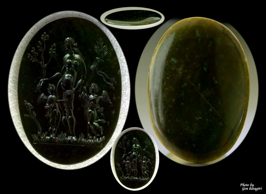 このインタリオは、古い年代の作品としても際だった特徴があるとても魅力的な作品です。 インタリオは18世紀後期から19世紀初頭にかけて流行しているので、この時代の作品には大型の物も見かけるのですが、17世紀以前の作品でこのような大型の物(5cm×3,6cm)は滅多にある物ではありません!! 何故なら カメオはジュエリーとして身を飾る目的で作られる物ですが、インタリオは違います。古い年代のインタリオほどジュエリーとしての意味の他に、印章、お守り、呪術的な意味や身分を表す為などの目的で作られた作品が多く、このインタリオのようにモチーフが宗教とは関係がなく、印章やお守りなどの実用的な目的で作られた作品でもない、純粋にジュエリーとして楽しむ為に作られて作品というものは極めて少ないものなのです!! 僕は、インタリオは世の中で最も解りにくい小さな彫刻であり、それだけに奥の深い面白さがあると思っていますが、この大型のインタリオ『緑の中のヴィーナス』 は、特に明るい日の光の下で見るとカメオに勝るとも劣らないジュエリーとしての魅力があるのです!!♪つまり実際に身につけた時にその効果を発揮する美しいジュエリーとしての魅力を備えているのです!♪ それはこれだけの大きさがあるからこそ表現出来た事で、緑の中のヴィーナスの美しい姿がルーペで見なくてもはっきり解るのが魅力なのです♪ 使われている石はブラッドジャスパーというとても珍しい石で、ブラッドストーンとはまた違う赤い斑点があるのが特徴で、裏から光りを当てて見ていると、まるでうっそうとした茂みの中にキューピッドを従えた美しい姿態のヴィーナスが立っているようで、正に幻想の美といえるイメージです!!♪ Venus はローマ神話の女神で本来は菜園を司る神ですが、後にギリシア神話における豊饒の女神アフロディーテと同一視され、美と愛の女神と考えられるようになりました。それ故に作者は、緑滴るイメージの美しいブラッドジャスパーを見て、『緑の中のヴィーナス』 のモチーフが閃いたのではないかと僕は考えています!♪ インタリオは、目で見るだけではどんな素晴らしい彫りでもその魅力は解らない物で、粘土かシーリングワックスに押して初めて、その彫りがどれだけ魅力に溢れるものかが解るのですが、このように大型の作品ならカメオのように身につけて楽しめるのが最大の魅力です!♪ しかもこの薄さが良いのです。大型のわりにはとても軽いので、ブローチ兼ペンダントのフレームを作れば現代の洋服にもとても使いやすいと思います!♪ この魅力溢れるインタリオ『緑の中のヴィーナス』は400〜500年も前に作られた極めて希少価値のある作品であるのにも関わらず、19世紀のどこのアンティークショップでも沢山見かける19世紀中期のカメオと変わらない価格なのは、僕のプライスが採算ラインぎりぎりの良心的なものであるからなのです。そこのところをご理解頂ければと思います。 表面に若干のヒビがありますが、とても浅いヒビですし、これだけの希少性のある古い年代の作品である事を考えれば全く問題の無い範囲のことです。 |