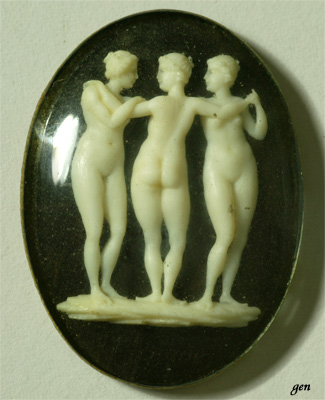 | カーブドアイボリー ブローチ サインドピース アイボリー ディエップ canadei 作 フランス 18世紀後期 3cm×2.3cm 黒く彩色された木にアイボリーで出来た3女神がセットされていま す。 彫りはとても繊細で女神の柔らかな体の線や表情が細かく表現されていま す。アイボリーという素材、モチーフ、繊細な彫りが詩的な印象を与える カーブドアイボリーです。 僕も32年間この仕事をやっているけど見たことのない物ですね〜! とてもアーティステッィクなカーブドアイボリー!♪ サインドピースというのも頷けます。 これはカメオというべきかカーブドアイボリーというべきなのか迷うところです。 普通のよく見かけるアイボリーのカメオは、僕は扱いません! 何故ならつまらない物だから・・。その割に高いしね(笑) |