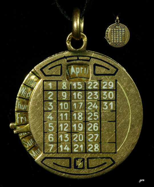 万年カレンダー・ペンダントなんて役に立つようで立たない物を作るのは世界広しといえどヴィクトリア時代の英国人だけでしょうね〜(笑)。以前にセミオートマチック・ブックマーカー(半自動しおり)なんてのも買ったことがありましたが、ユーモア好きですよね〜♪ こういう遊び心満点の物って面白いですよ! 9Kではなくて15Kで作られていますから、ちゃんと高級な物として作られているのです。 皆さんは数字と黒いラインが凄く手間の掛かる仕事で描かれているのに気づかれましたでしょうか? これはエナメルで単に描いているのではなく、金の台を彫ってエナメルを入れ、炉に入れて焼き付けているのです。 それは次ページの拡大画像を見て頂ければ解ります。 |