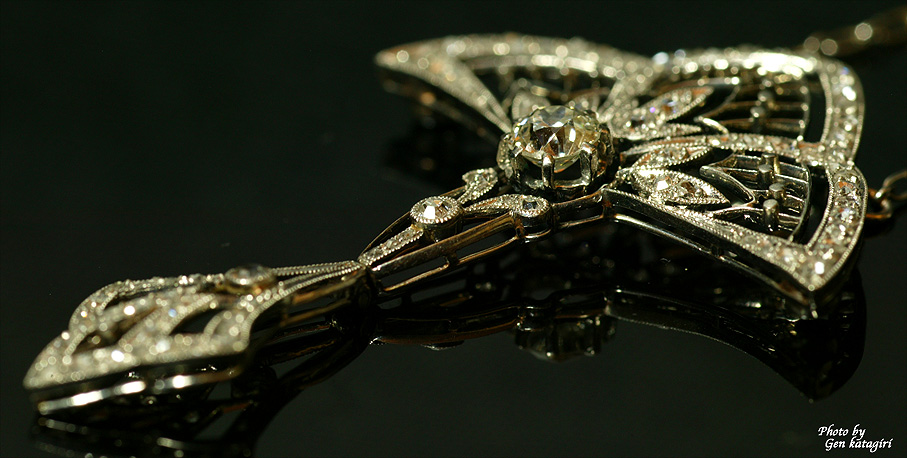 | この角度で見ると、上部の扇のような部分と下部が立体的に作られているのが良く解ります。この微妙な立体感が美しさの根源なのですが、これが実は非常に難しい作りなのです!ミキモトが昔博覧会に出品したあの矢車草のブローチは確かに素晴らしい作りですが、平面的なデザインなのがデザイン上の大きな欠点です。 本体の下に下がる部分が揺れるように出来ていますが、前面からはそれは解らない特殊な構造なのにご注目ください。裏の画像でその構造が解ります。 センターの大きな美しいダイヤは、オールドヨーロピアンカットの特徴であるテーブル(上部の平らな部分)が小さく厚みがあるのが解ります。皆さんはともすると大きなダイヤだけに目が行くかもしれませんが、実は縁取りに使われている小さなダイヤもこのネックレスの美しさに多大な貢献をしているのを知るべきなのです!このような使い方のダイヤは小さければ小さい程魅力的な輝きが出るのですから・・。 18世紀後期〜19世紀初頭のダイヤモンド・ジュエリーでは、このような極小のローズカットダイヤモンドを使ったそれは美しいジュエリーが作られているのですが、その後はその美しさが忘れられてしまったのかほとんど見かけません。 ローズカットは、小さくても厚みがあってカットが良ければ鋭く美しい輝きが出ます。そしてこのように連続して多数の石を留めてある場合は、小さければ小さい程美しい輝きを発揮するのです! でも、小さければ小さい程留めるのは難しいので、余程高度な石止めの技術がないと出来ない仕事なのです! この画像の奥と左手前の美しいボケは、極小のローズカットダイヤモンドの輝きが如何に魅惑の輝きであるかの証です!♪ |
