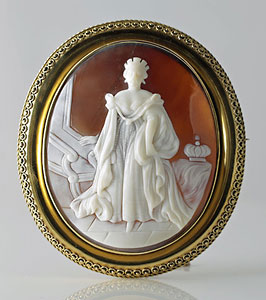 シェルカメオ・ブローチ イギリス 1860年頃 18歳で即位したヴィクトリアの決意に満ちた立ち姿を彫っています。 |