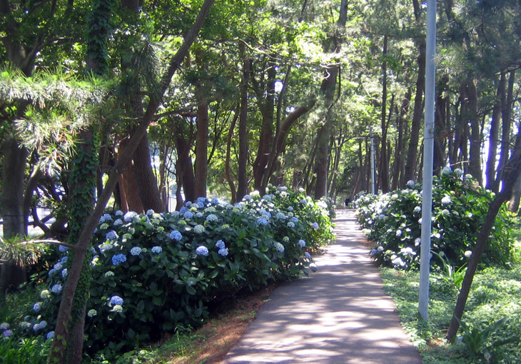 松林の中を歩いていたら紫陽花の群生に出会いました。紫陽花の小道は清々しい小道でしたね。