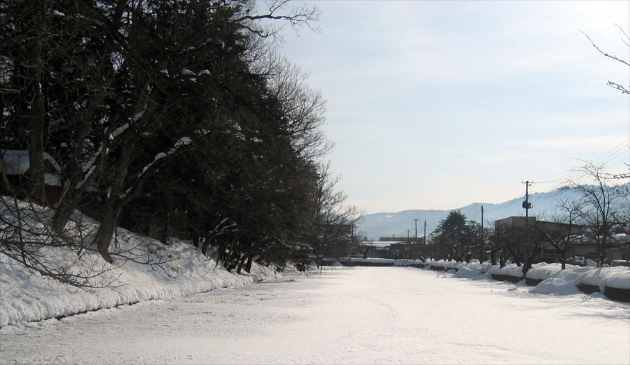 ここは米沢藩の城跡のお堀です。北国でも雪国はこのように氷の上に雪が積もってしまうので、スケートは出来ないんです。僕はアイススケートも好きだったので隣町まで行って室内スケートリンクで滑っていましたが、一度天然の固くて良く滑る氷で滑ったみたいものです。スケートはバックのコーナリングが出来ると面白いんですよ♪後ろにカーブを描いて移動する感覚は、非日常的な感覚だから、感性のリフレッシュに役に立つんですよ(笑) |