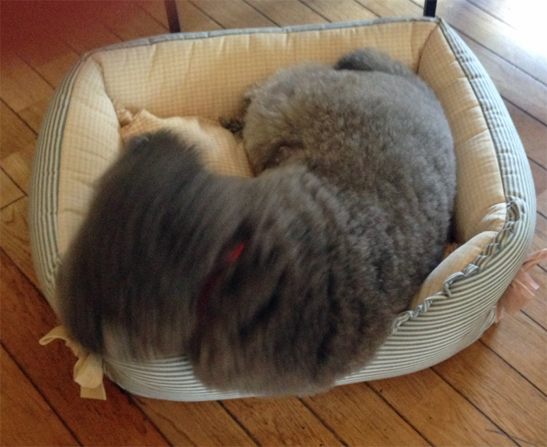 | 散歩コースのペット用品点でセールをやっていたので、小元太にベッドを買ってやりました♪ リボンが付いた可愛いベッドです。 |