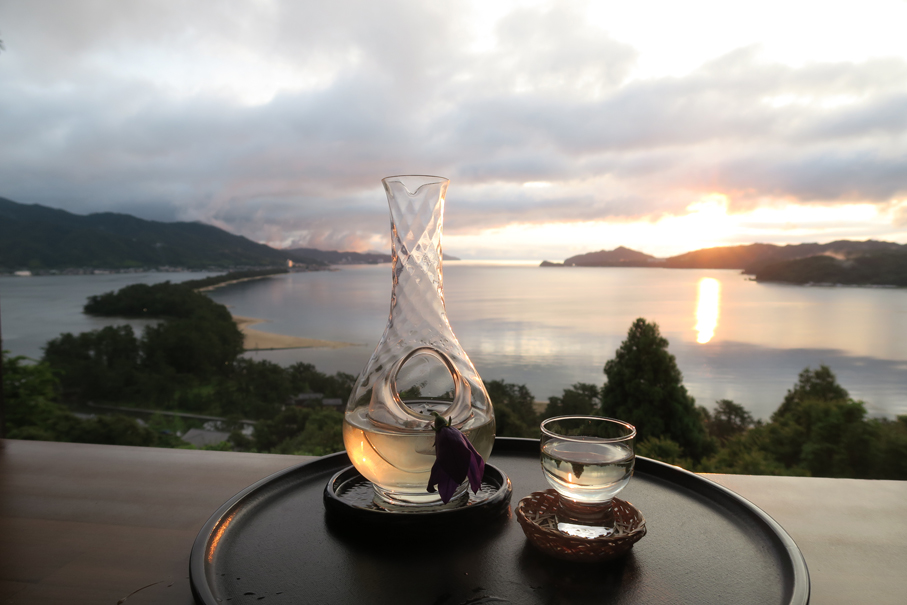 | ここは天橋立の高台の一軒家、玄妙庵という旅館です。 来る途中は土砂降りの豪雨だったので、豪雨の天橋立はどんな風景なんだろうと思っていたのですが、雨が止んで曇りのお天気でした。 玄妙庵は天皇陛下が泊まったこともある、由緒のある旅館で僕が泊まった部屋も何とか親王がお泊まりになられた部屋で、この旅館の最も眺めの良い部屋でした。 この画像は翌朝の4時頃にふと目が覚めたら、何と雲の切れ目から太陽が顔を出し、宮津湾の海面が何とも美しいグラデーションになって輝き、その中片隅に自然の造形の宝物(砂嘴)が見える、正に絶景だったんです!♪ そしてこういう美しい風景の中でお酒を飲もうと、昨日の夜から準備してあったお酒を飲みながら、太陽が雲に隠れるまで眺めていました。 朝酒、朝寝、昼酒、昼寝、もちろん夜も酒・・・・(笑)。二連泊すると、のんべいはこうなるんです(笑)。 |