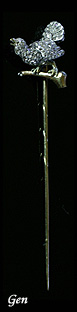 小さなダイヤを使ったジュエリーで、これ程の見事な仕事の物があったとはと感激してくれたのです!!価格を言ったら二度びっくり!!そんなに安いのなら僕が欲しいと言っていました! いや〜、嬉しいですね〜♪ これは極小のローズカットダイヤモンドの留め方が今では絶対に不可能な留め方で、ほとんど見えない程の小さな爪も使っているのもあるけれど、爪が無いのもあり、石が二つ並んでいる所はダイヤでダイヤを抑えるような信じられない留め方をしていると言っていました。 金の嘴と目の周りの金の縁取りは素晴らしい細工だと絶賛していました! 鳥の種類は七面鳥だろうとのことでした。 僕は鳥が乗っている小枝の裏にネジ穴のような物が二つあるのが不思議でならなかったのですが、鳥博士と言っても良いほど鳥に詳しい彼が、この鳥のピンは剥製をモデルにして作ったから、鳥の剥製が台に取り付けられている状態を忠実に再現したんじゃないかと言うのです。 それで謎は解明!! 僕はこの七面鳥の剥製の持ち主がこのピンの作者に剥製を持ち込み、ローズカットダイヤモンドのクラバット・ピンの製作を依頼したんじゃないかと思います。 だから台のねじ穴のような物まで忠実に再現したのでしょう。 このピンのように小さな作品を見る時は、その大きさを強く意識して見ないと、その本当の魅力や細工の凄さがなかなか分からないものなのです! 大きく拡大した画像を見ていると欠点とは言えない部分が欠点に感じられたりしますからね。 小さくて優れたジュエリーほど、実物を手に取って見てみないとその仕事の凄さや魅力は分からないものなので、僕はそれでいつも悔しい思いをしています!! 僕のギャラリーに来て実物を見て頂ければ、絶対に素晴らしい物だと分かって頂けるのにネットの画像と説明だけでは分かった頂けていない物が沢山あるんですよ。 例えばこれらのジュエリーが代表的な物です!! 画像をクリックしてご覧下さい。↓ これでこの問題に関しては終了致します。参加して頂いた皆さん、ありがとうございました<m(__)m> 次のクイズも準備してありますので、明日からスタート出来ると思います。お楽しみに〜♪